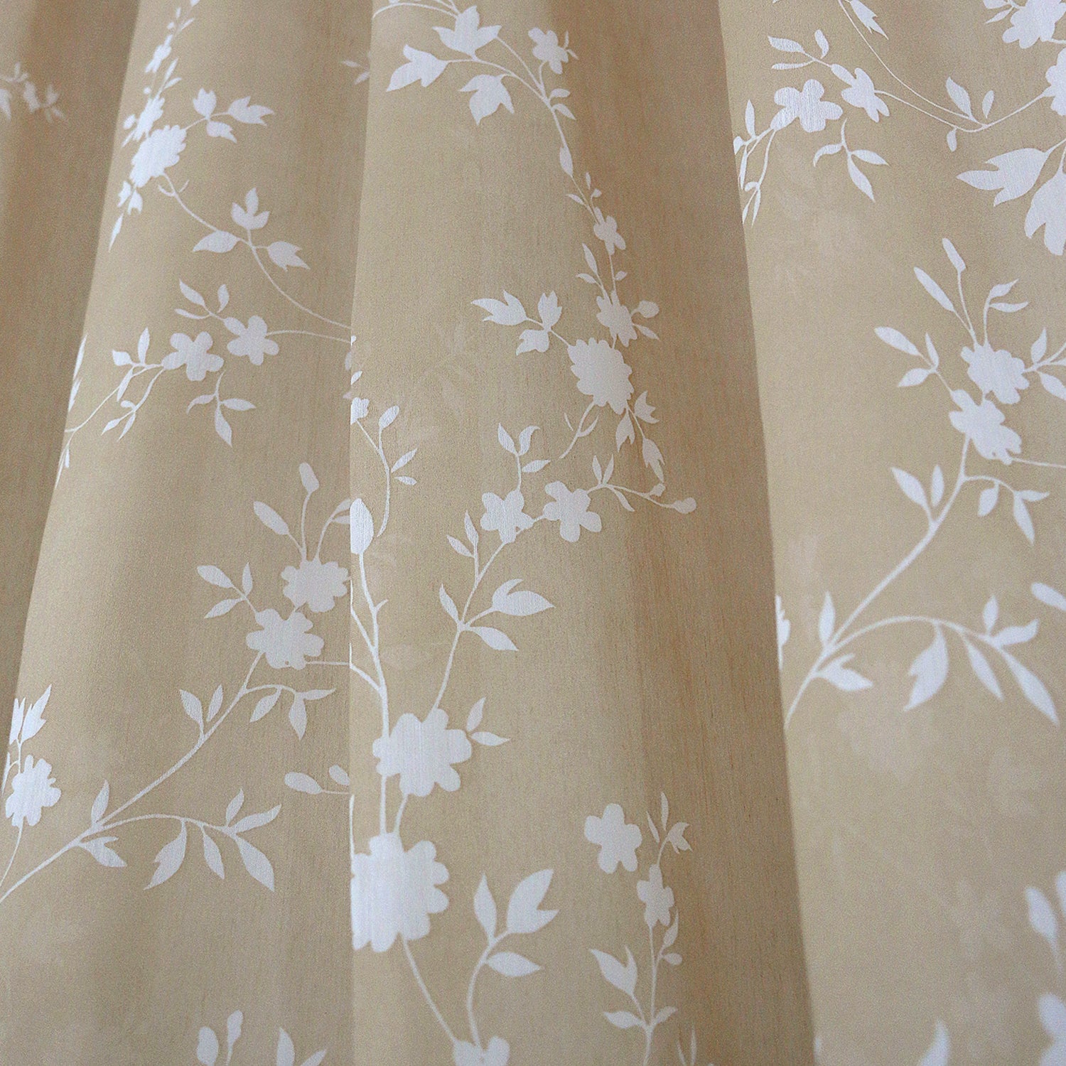 Maison Blanche matte voile curtain in beige color. The fabric is matte beige voile with discreet white flowers, very transparent that allows a lot of light into the space. It is already sewn with a 6 cm braid at the top ready for hanging, while at the bottom it has a weight. The dimension of each leaf is 145X290. The fabric is polyester with a very nice drape, is machine washable at 30 degrees and is easy to iron. Ideal as an interior but also recommended alone for all areas of the house, it gives a light and modern feel.