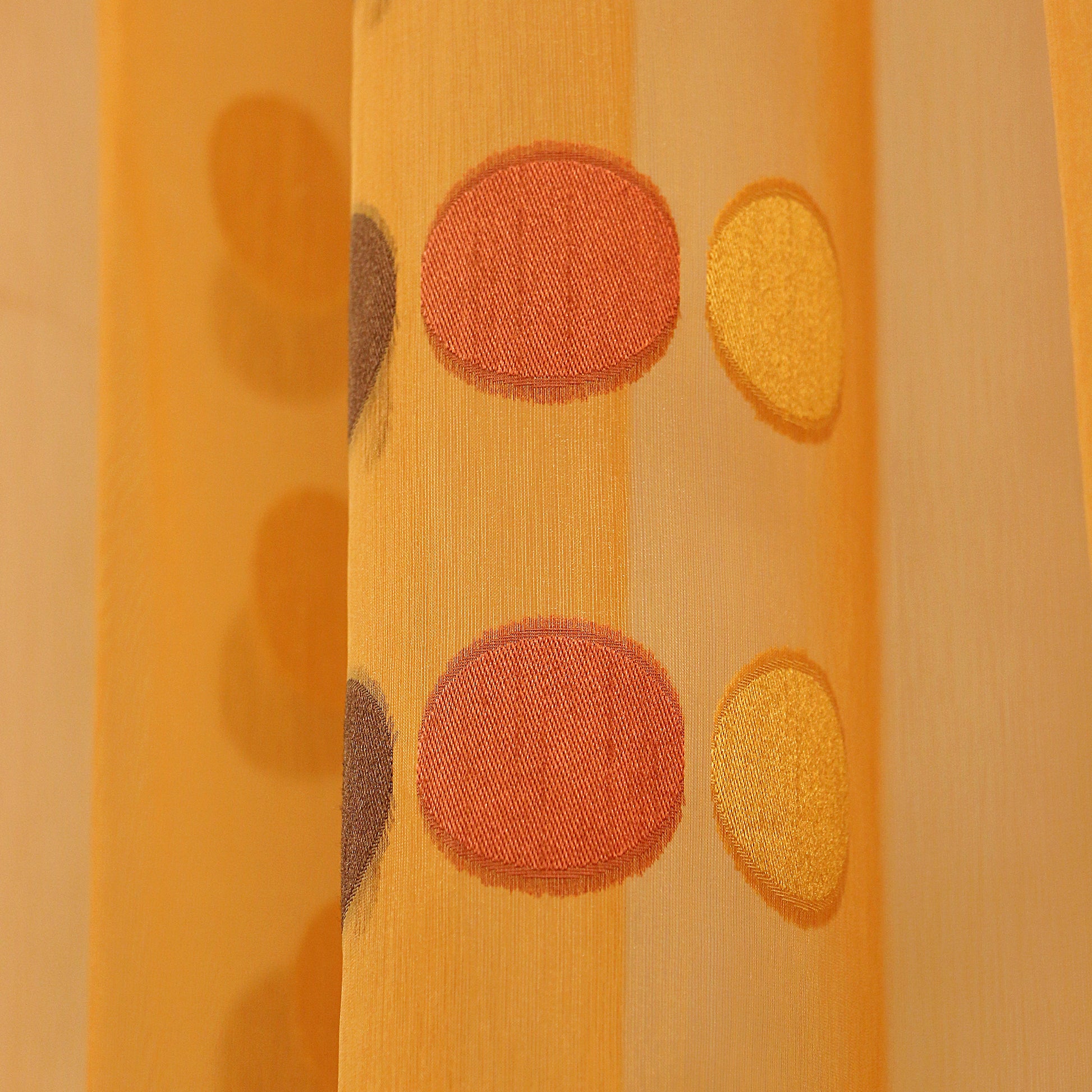 Organza jacquard curtain in tan color that creates small circles in gold, tile and brown, very transparent that allows light into the space. It is already sewn with a 6 cm braid at the top ready for hanging, while at the bottom it has a weight. The dimension of each leaf is 145x290. The fabric is polyester with a very nice drape, is machine washable at 30 degrees and is easy to iron. Recommended for all areas of the house.