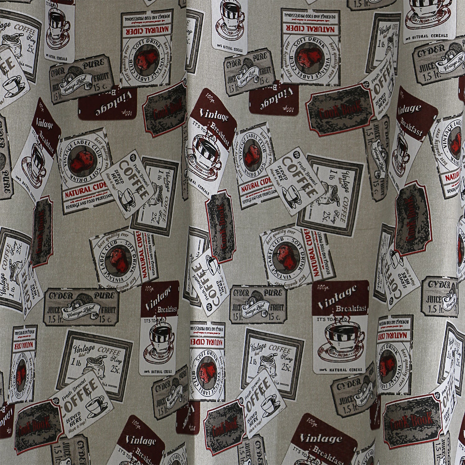 Εμπριμέ κουρτίνα από λονέτα με μπεζ φόντο και τυπωμένα σχέδια από ετικέτες σε αποχρώσεις του καφέ και του μπορντό. Το ύφασμα, με χαμηλή διαφάνεια, επιτρέπει τη διάχυση φωτός στον χώρο, προσφέροντας μια ζεστή και μοντέρνα ατμόσφαιρα. Είναι ήδη ραμμένη με τρέσα 8 εκ. στο επάνω μέρος, έτοιμη για κρέμασμα. Η διάσταση κάθε φύλλου είναι 145x270. Κατασκευασμένο από σύμμικτο ύφασμα με εξαιρετικό πέσιμο, πλένεται στο πλυντήριο στους 30 βαθμούς και σιδερώνεται εύκολα. Ιδανική για τοποθέτηση ως πλαϊνή κουρτίνα ή και μόνη της, προτείνεται κυρίως για την κουζίνα του σπιτιού, προσδίδοντας μοντέρνα αίσθηση στο χώρο.
