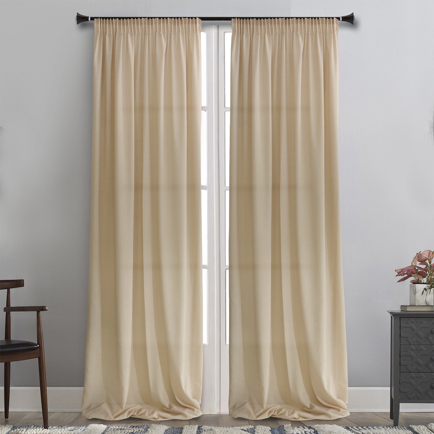 Kουρτίνα σε μπεζ χρώμα με μονόχρωμη γάζα υψηλής διαφάνειας που επιτρέπει αρκετό φως μέσα στο χώρο. Είναι ήδη ραμμένη με τρέσα 8 εκ. στο επάνω μέρος έτοιμη για κρέμασμα. Η διάσταση κάθε φύλλου είναι 145x285. Το ύφασμα είναι πολυεστερικό με πολύ ωραίο πέσιμο, πλένεται στο πλυντήριο και είναι εύκολο στο σιδέρωμα. Ουδέτερη, απλή και μοντέρνα θα δώσει χρώμα στον χώρο σας, συνδυάζεται εύκολα με πολλά υφάσματα αλλά και μόνη, προτείνεται για όλους τους χώρους του σπιτιού.