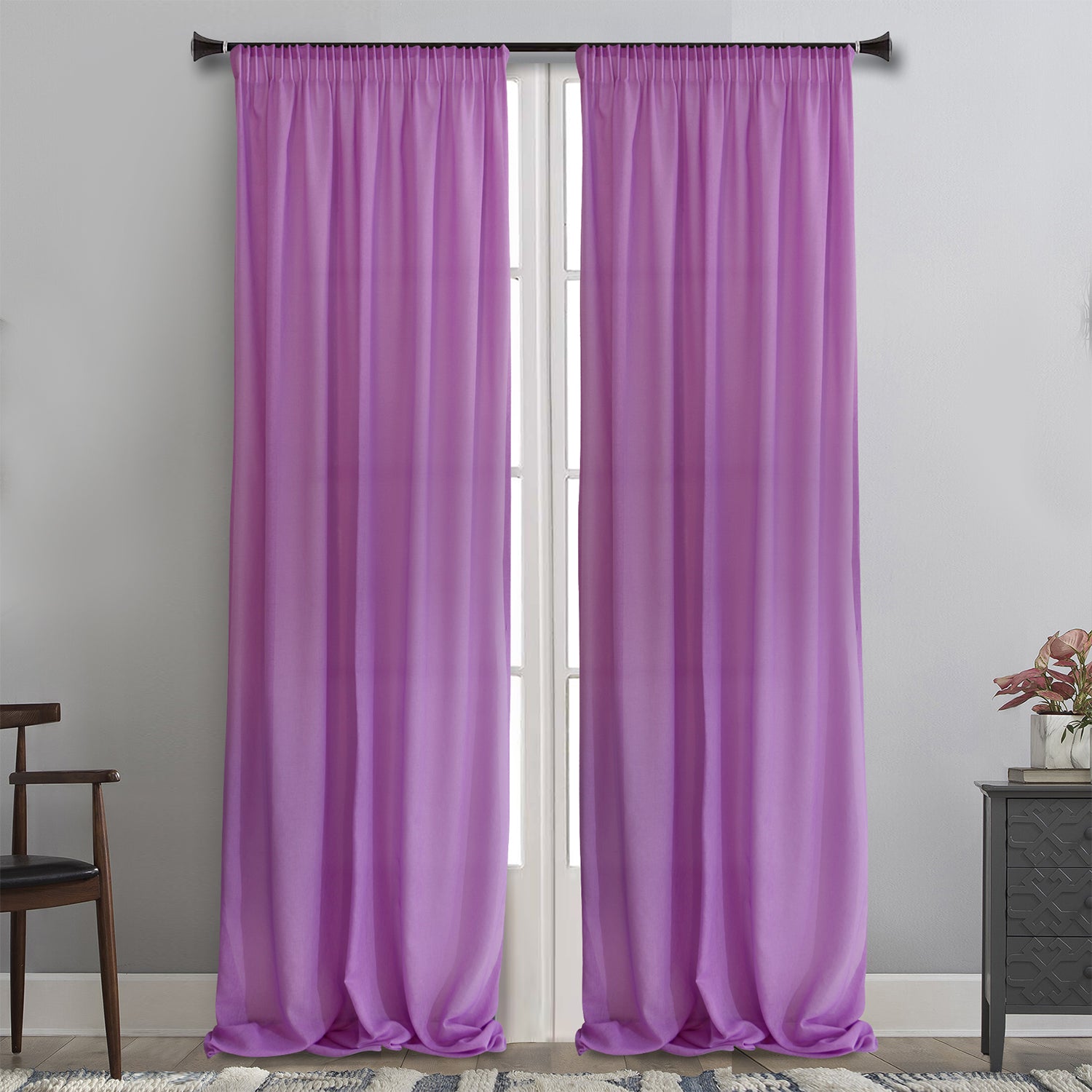 Κουρτίνα σε λιλά χρώμα με γάζα υψηλής διαφάνειας που επιτρέπει αρκετό φως μέσα στο χώρο. Είναι ήδη ραμμένη με τρέσα 8 εκ. στο επάνω μέρος έτοιμη για κρέμασμα, ενώ στο κάτω μέρος έχει βαρίδι. Η διάσταση κάθε φύλλου είναι 145x285. Το ύφασμα είναι πολυεστερικό με πολύ ωραίο πέσιμο, πλένεται στο πλυντήριο και είναι εύκολο στο σιδέρωμα. Ουδέτερη, απλή και μοντέρνα θα δώσει χρώμα στον χώρο σας, συνδυάζεται εύκολα με πολλά υφάσματα αλλά και μόνη, προτείνεται για όλους τους χώρους του σπιτιού.
