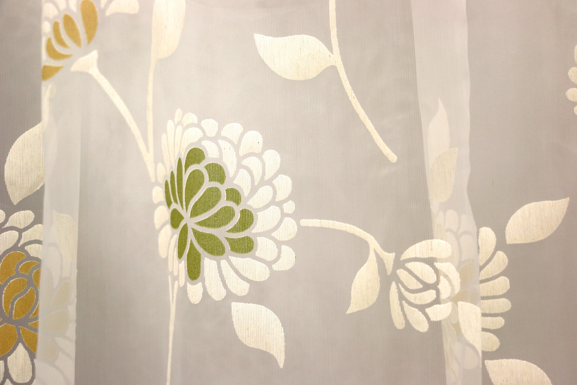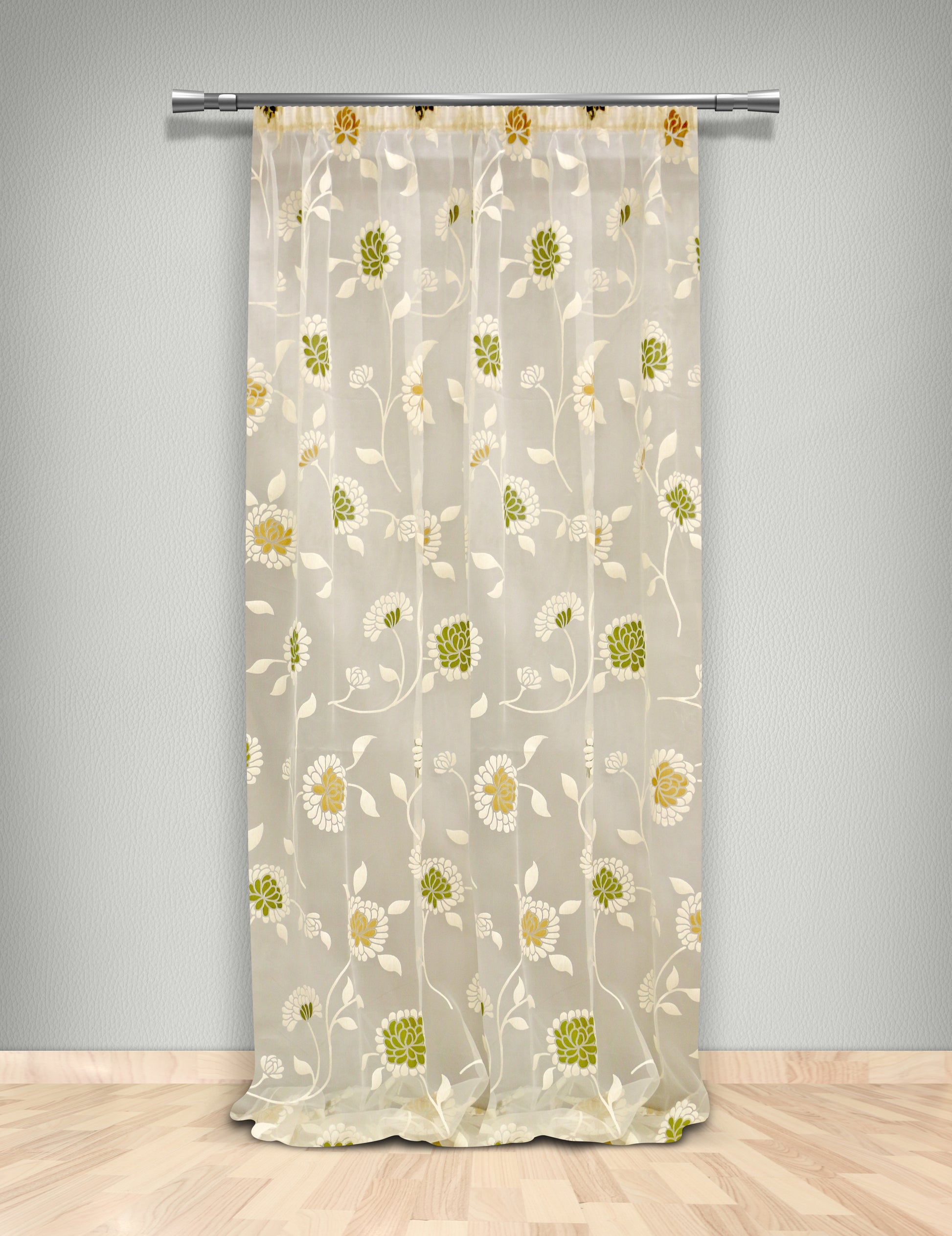 Κουρτίνα σε σπασμένο λευκό χρώμα με σχέδια ντεβορέ. Το ύφασμα είναι μονόχρωμη οργάντζα λευκή και έχει αδιαφανή λουλούδια σε εκρού, λαδί και ταμπά, υψηλής διαφάνειας που επιτρέπει πολύ φως μέσα στο χώρο. Είναι ήδη ραμμένη με τρέσα 6 εκ. στο επάνω μέρος έτοιμη για κρέμασμα, ενώ στο κάτω μέρος έχει βαρίδι. Η διάσταση κάθε φύλλου είναι 145x300. Το ύφασμα είναι πολυεστερικό με πολύ ωραίο πέσιμο, πλένεται στο πλυντήριο και είναι εύκολο στο σιδέρωμα. Είναι εξαιρετικής ποιότητας μπορεί να χρησιμοποιηθεί μόνη της ή ως εσωτερική, συνδυάζεται με λινό πλαϊνό μονόχρωμο. Προτείνεται για όλους τους χώρους του σπιτιού.