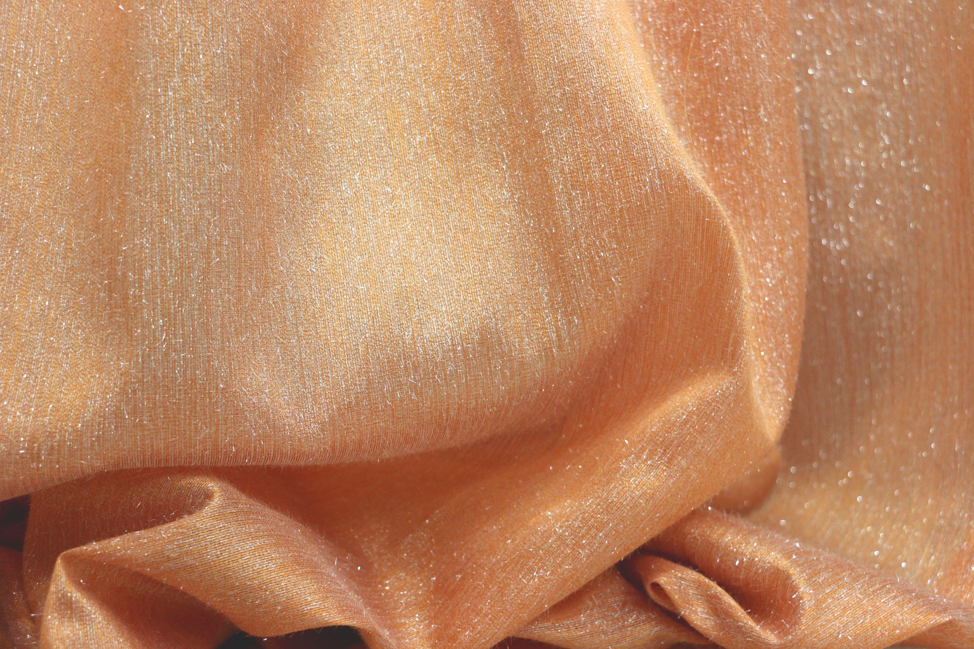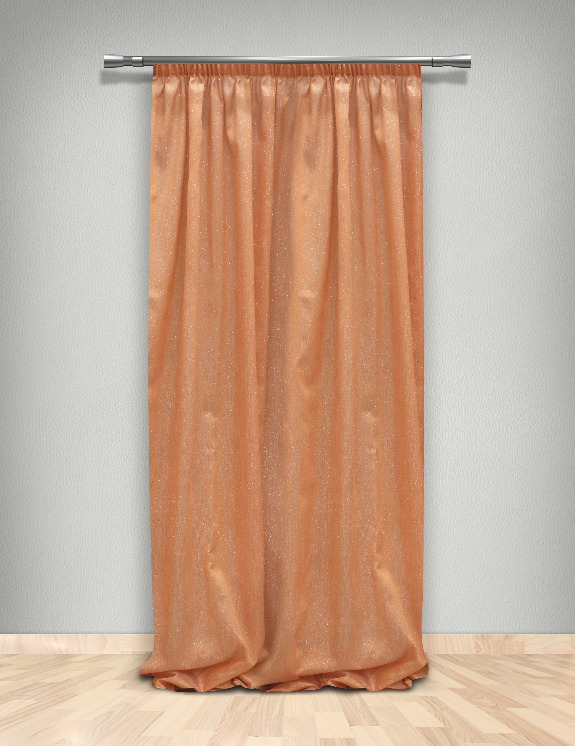Kουρτίνα σε σομόν χρώμα με γυαλιστερές ίνες σε ασημί χρώμα, ιδιαίτερα εντυπωσιακό και πολυτελές, χαμηλής διαφάνειας που επιτρέπει σχετικά λίγο φως μέσα στο χώρο. Είναι ήδη ραμμένη με τρέσα 6 εκ. στο επάνω μέρος έτοιμη για κρέμασμα, ενώ στο κάτω μέρος έχει βαρύδι. Η διάσταση κάθε φύλλου είναι 145x300. Το ύφασμα είναι πολυεστερικό με πολύ ωραίο πέσιμο και υφή, πλένεται στο πλυντήριο και είναι εύκολο στο σιδέρωμα. Είναι εξαιρετικής ποιότητας  μπορεί να χρησιμοποιηθεί μόνη της ή πλαϊνή, συνδυάζεται με οργάντζα ριγέ στα ίδια χρώματα. Προτείνεται για όλους τους χώρους του σπιτιού.