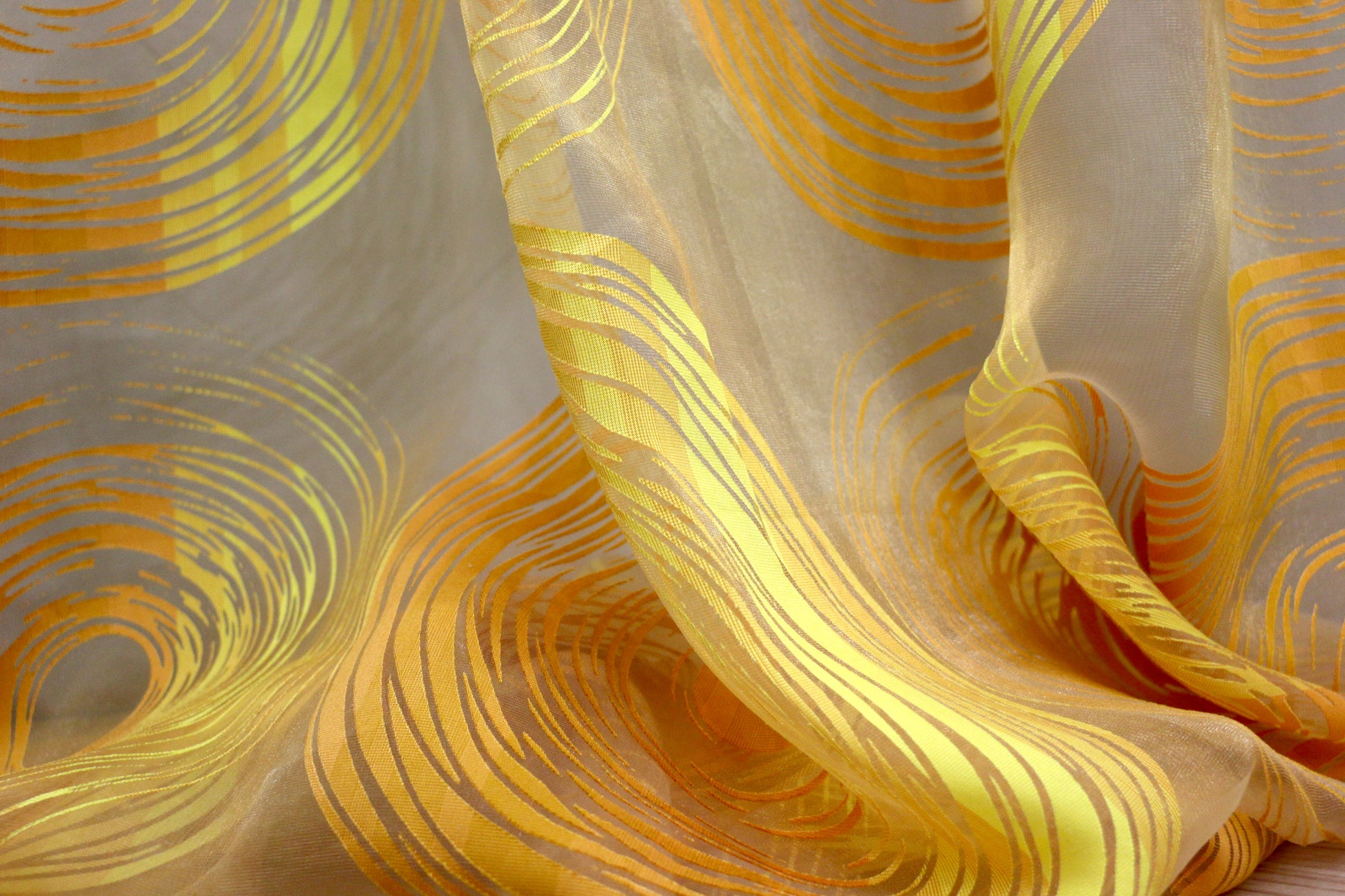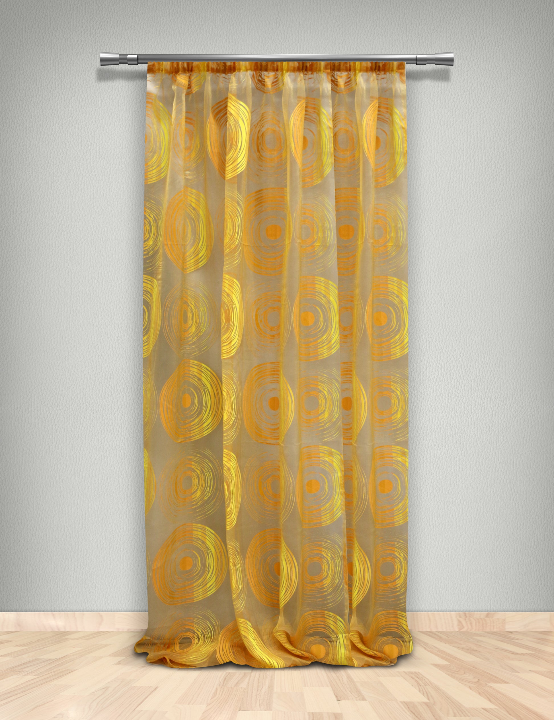 Εμπριμέ κουρτίνα με ενδοϋφασμένους μοντέρνους γραμμικούς κύκλους σε κίτρινο, ανοιχτό και σκούρο πορτοκαλί, υψηλής διαφάνειας που επιτρέπει πολύ φως μέσα στο χώρο. Είναι ήδη ραμμένη με τρέσα 6 εκ. στο επάνω μέρος έτοιμη για κρέμασμα. Η διάσταση κάθε φύλλου είναι 145x300. Το ύφασμα είναι πολυεστερικό  με πολύ ωραίο πέσιμο, πλένεται στο πλυντήριο και είναι εύκολο στο σιδέρωμα. Είναι εξαιρετικής ποιότητας μπορεί να χρησιμοποιηθεί μόνη της ή ως εσωτερική. Συνδυάζεται με ταφτά στα ίδια σχέδια και χρώματα. Προτείνεται για όλους τους χώρους του σπιτιού.