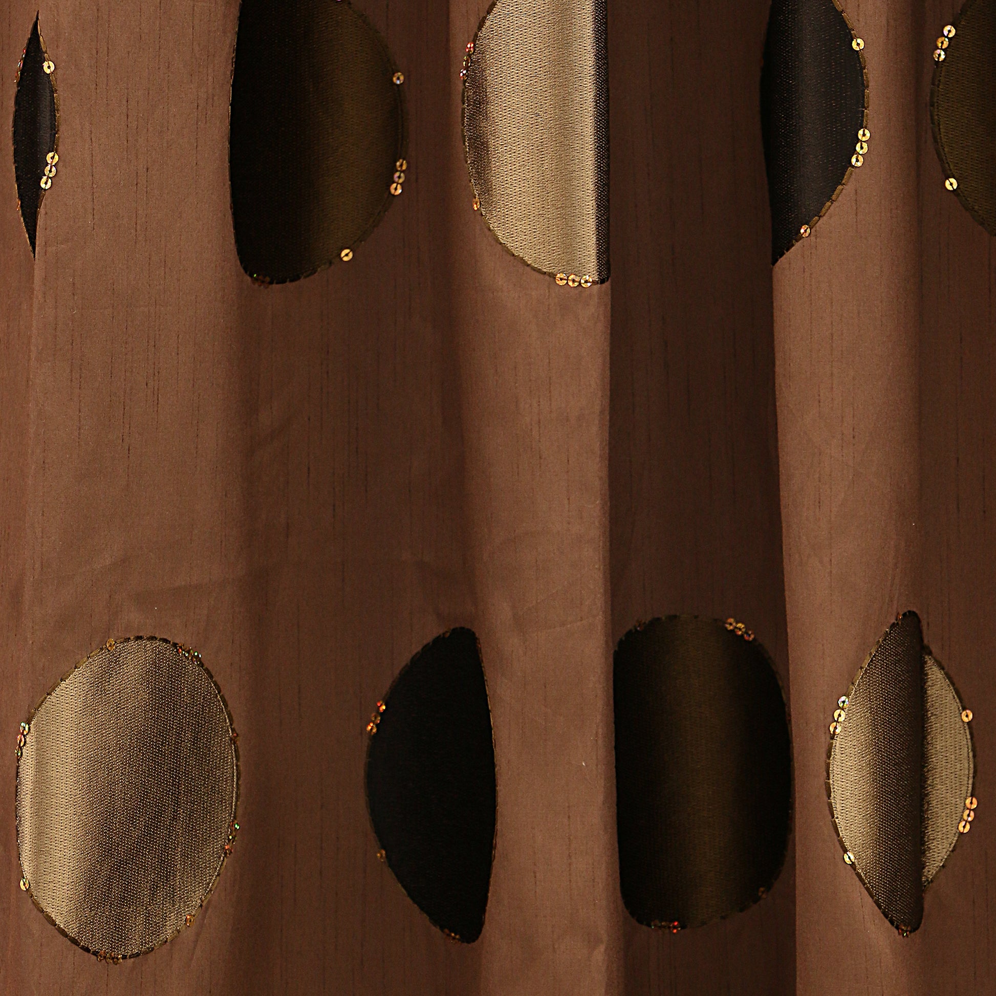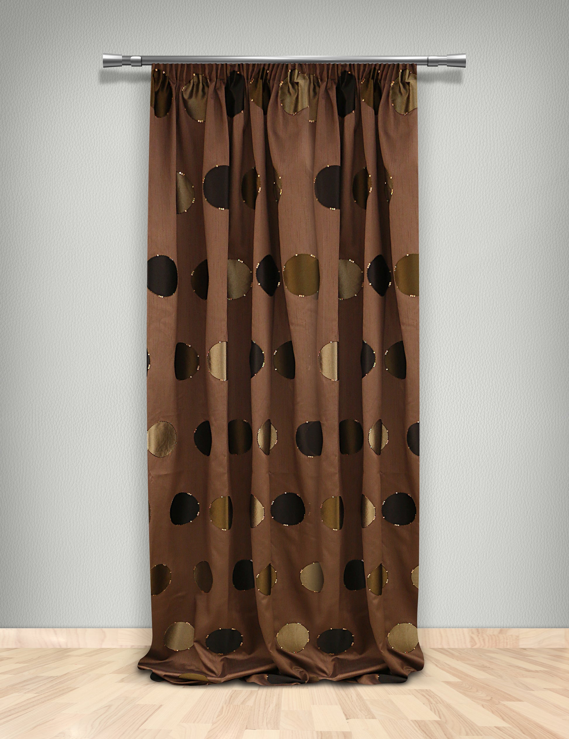 Κουρτίνα ταφτάς ζακάρ σε καφέ χρώμα με ζακάρ κύκλους σε απαλό καφέ, χρυσό και σκούρο καφέ που περιμετρικά έχουν κορδόνι και παγιέτες, μικρής διαφάνειας που επιτρέπει σχετικά λίγο φως μέσα στο χώρο. Είναι ήδη ραμμένη με τρέσα 6 εκ. στο επάνω μέρος έτοιμη για κρέμασμα, ενώ στο κάτω μέρος έχει βαρίδι. Η διάσταση κάθε φύλλου είναι 145x280. Το ύφασμα είναι πολυεστερικό με πολύ ωραίο πέσιμο, πλένεται στο πλυντήριο στους 30 βαθμούς και σιδερώνεται εύκολα. Ιδανική ως πλαϊνή αλλά και μόνη της για όλους τους χώρους του σπιτιού χαρίζει αίσθηση εξαιρετικής πολυτέλειας.
