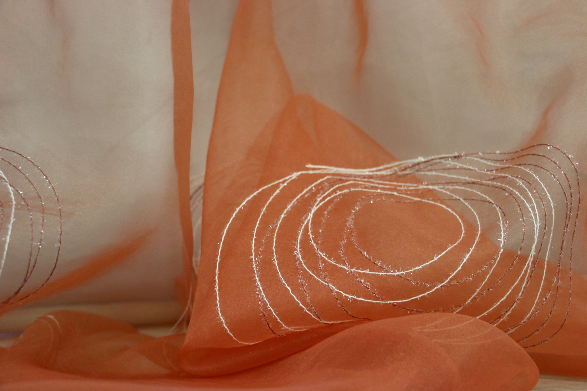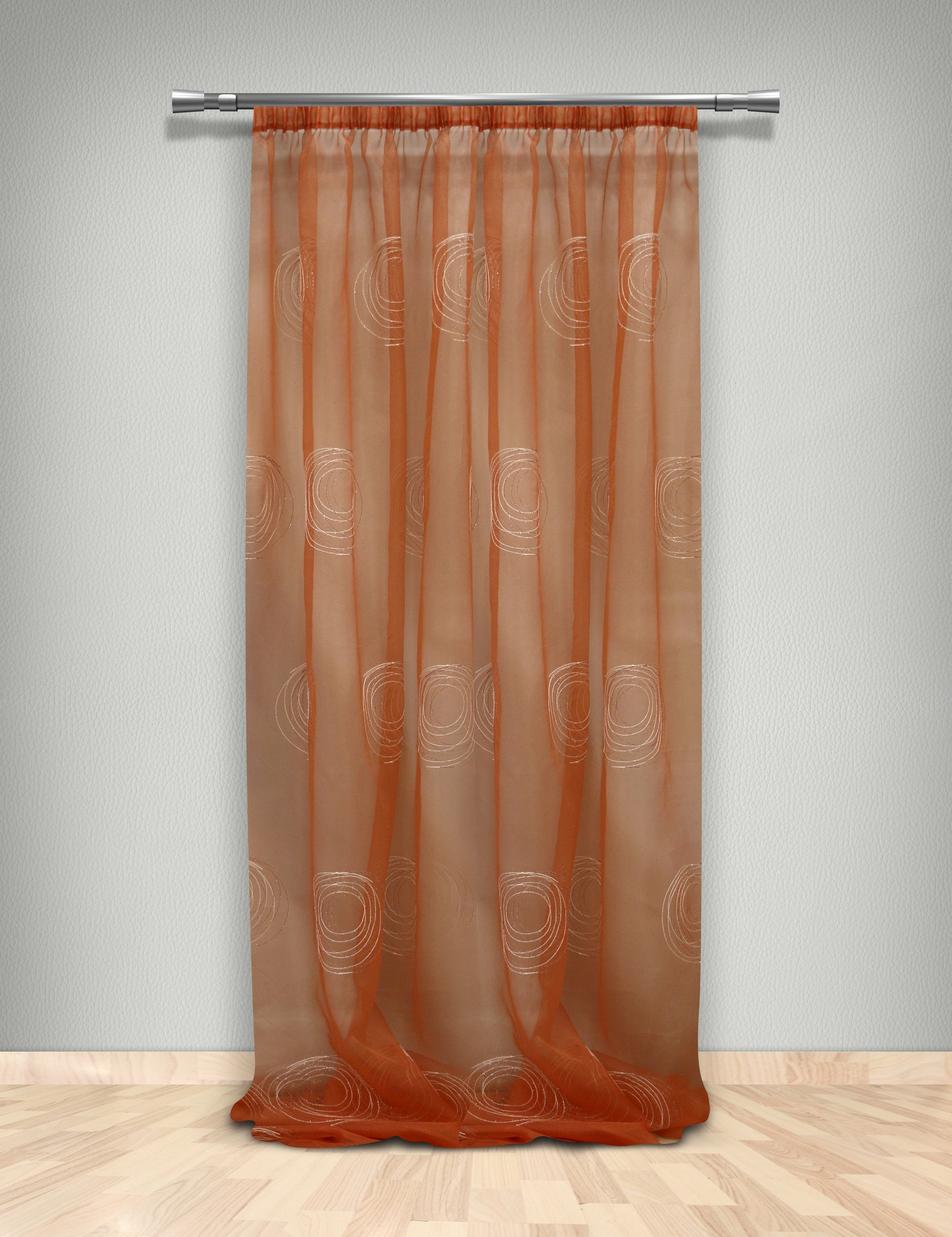 Κεντητή κουρτίνα με μοντέρνους γραμμικούς κύκλους σε κεραμιδί και εκρού με νήματα με εδοϋφασμένες γυαλιστερές ίνες, ιδιαίτερα εντυπωσιακό και πολυτελές, υψηλής διαφάνειας που επιτρέπει πολύ φως μέσα στο χώρο. Είναι ήδη ραμμένη με τρέσα 6 εκ. στο επάνω μέρος έτοιμη για κρέμασμα ενώ στο κάτω μέρος έχει βαρίδι. Η διάσταση κάθε φύλλου είναι 145x300. Το ύφασμα είναι πολυεστερικό με πολύ ωραίο πέσιμο, πλένεται στο πλυντήριο και είναι εύκολο στο σιδέρωμα. Είναι εξαιρετικής ποιότητας μπορεί να χρησιμοποιηθεί μόνη της ή ως εσωτερική. Προτείνεται για όλους τους χώρους του σπιτιού.